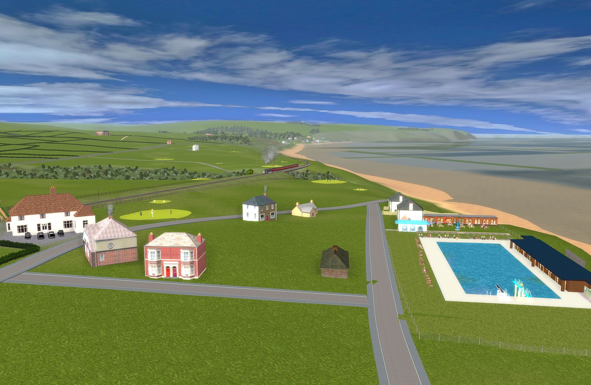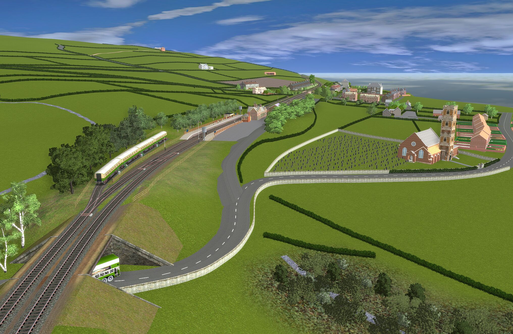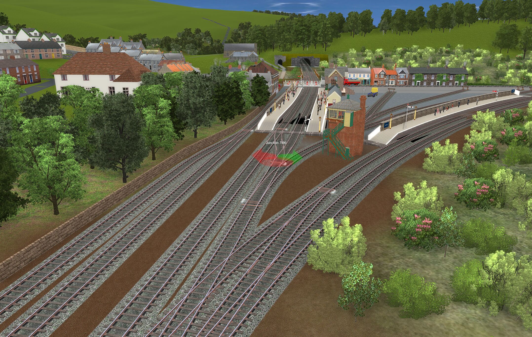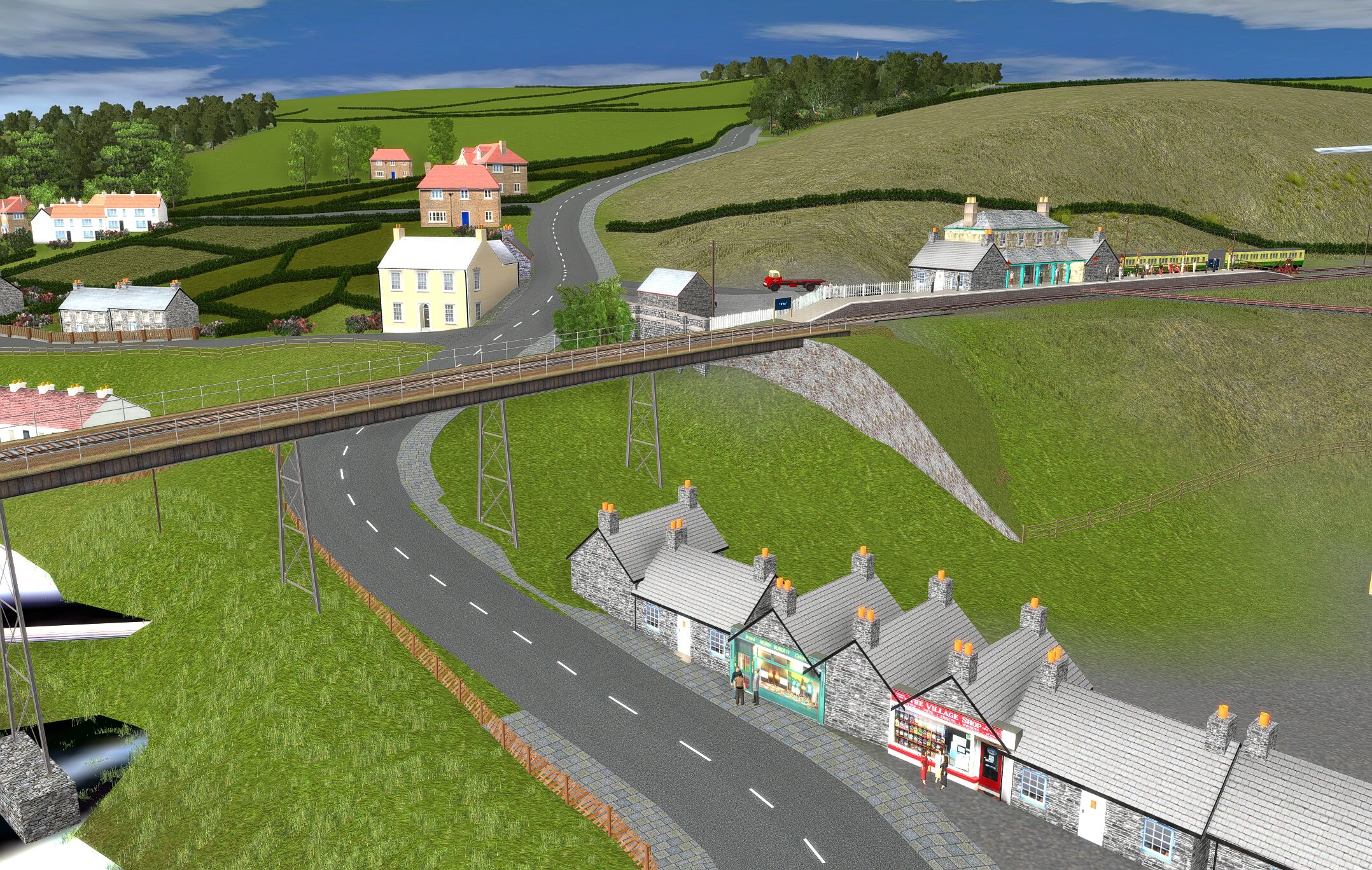 | The layout is based in the 1950s and uses only assets freely available on the Download Centre. Consequently much original detail cannot be recreated. The terrain is created from a digital OS map and so is reasonably accurate as are distances and rail line gradients. |