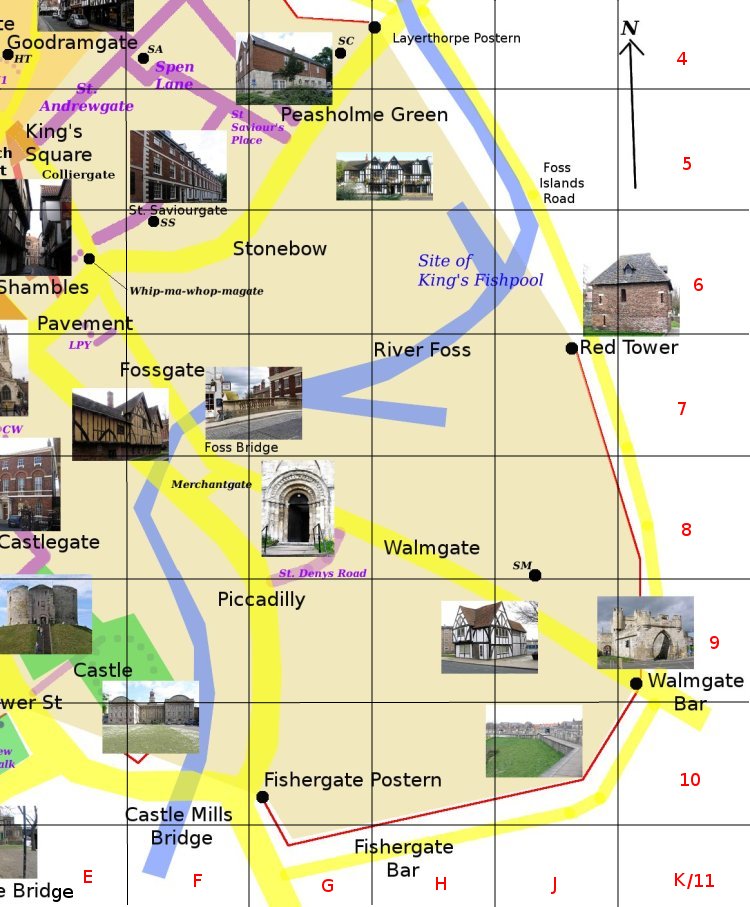 WalmgateG8-K9 Lengthy (for York within the walls) street running south east from Foss Bridge (Fossgate) to Walmgate Bar. Contains St. Denys' church (Norman door pictured) and the late 14th century Bowes Morrell House (pictured). At its south eastern end is Walmgate Bar, the last gate in York to retain its full barbican (pictured). Photo: taken 2005-7 |