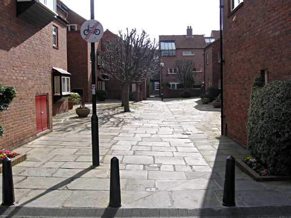 Modern Housing in BedernRun down in the 19th and 20th centuries, the area of York between Micklegate and Peasholme Green has been much redeveloped to bring back permanent residents within the walls. Here is the redeveloped, pedestrianised area of the Bedern. Photo: taken 18 March 2006 |