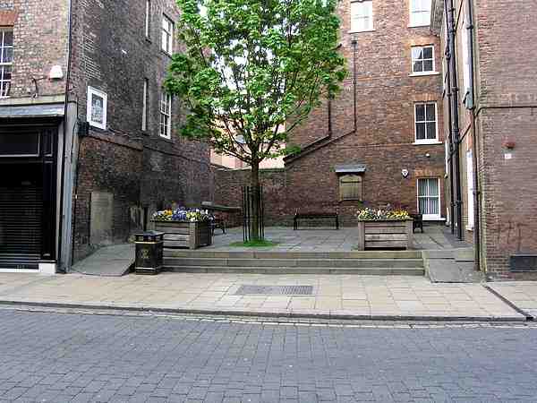 Churchyard for St Helen's church.Initially a triangular shaped piece of land in front of St. Helen's Church occupying what is now St. Helen's Square. Davygate diverted past it on the south to meet Coney Street outside the Mansion House and Petergate extended up the north side. Although a footpath existed across the yard by the church, it was a major impediment to traffic accessing the new Mansion House as well as blocking the view, since the yard was raised above street height. Levelling and paving gave the first St. Helen's Square, though still smaller than that of today. The removal of Davy Hall in 1744 gave the church this new burial site about 330 m (360 yds) to the south east of the church. Photo: taken Sunday morning, 29 April 2007. |