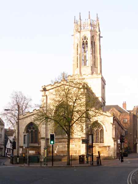 View from Pavement.This is a preconquest church being mentioned in the Domesday Book in 1087. It was enlarged in the 12th century and was rebuilt in the 14th century and the west tower built in 1400. In 1782 the chancel was removed (it was directly ahead in this view) and the space used to enlarge the Pavement market place. The lantern tower (28 m, 93ft high), a York landmark, was rebuilt in the 19th century and is lit as a memorial to the citizens of York who lost their lives in the two world wars. (Ref. 1). As well as the 13th century door knocker on the north door, the church has 14th century glass in the west window (from St. Saviour's), a 15th century lectern (from St. Crux) and a 17th century pulpit. (Ref. 7) Photo: taken 15 April 2007 |