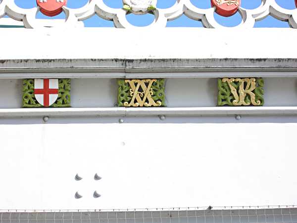 On outside of parapet, the cross of St George together with the building date: the 20th year of the reign of Queen Victoria.