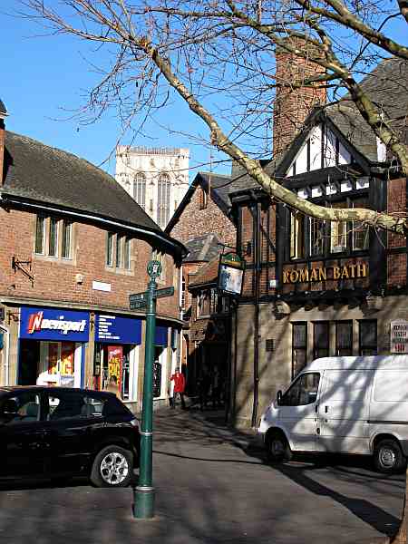 North corner of St. Sampson's Square.At this corner Finkle Street leaves the square on a line towards the centre of the Roman fortress where the Minster central tower can now be seen. In this corner the remains of a Roman bath house have been discovered and are open for viewing. The presence of a bath house inside a Roman fortress is unusual and perhaps occurred before the establishment of baths in the Civitas across the river, for the bath house was only used for a period in the middle of the fortress's history. (Ref. 2 for the facts, my speculation.) Photo: taken 2 February 2007 |