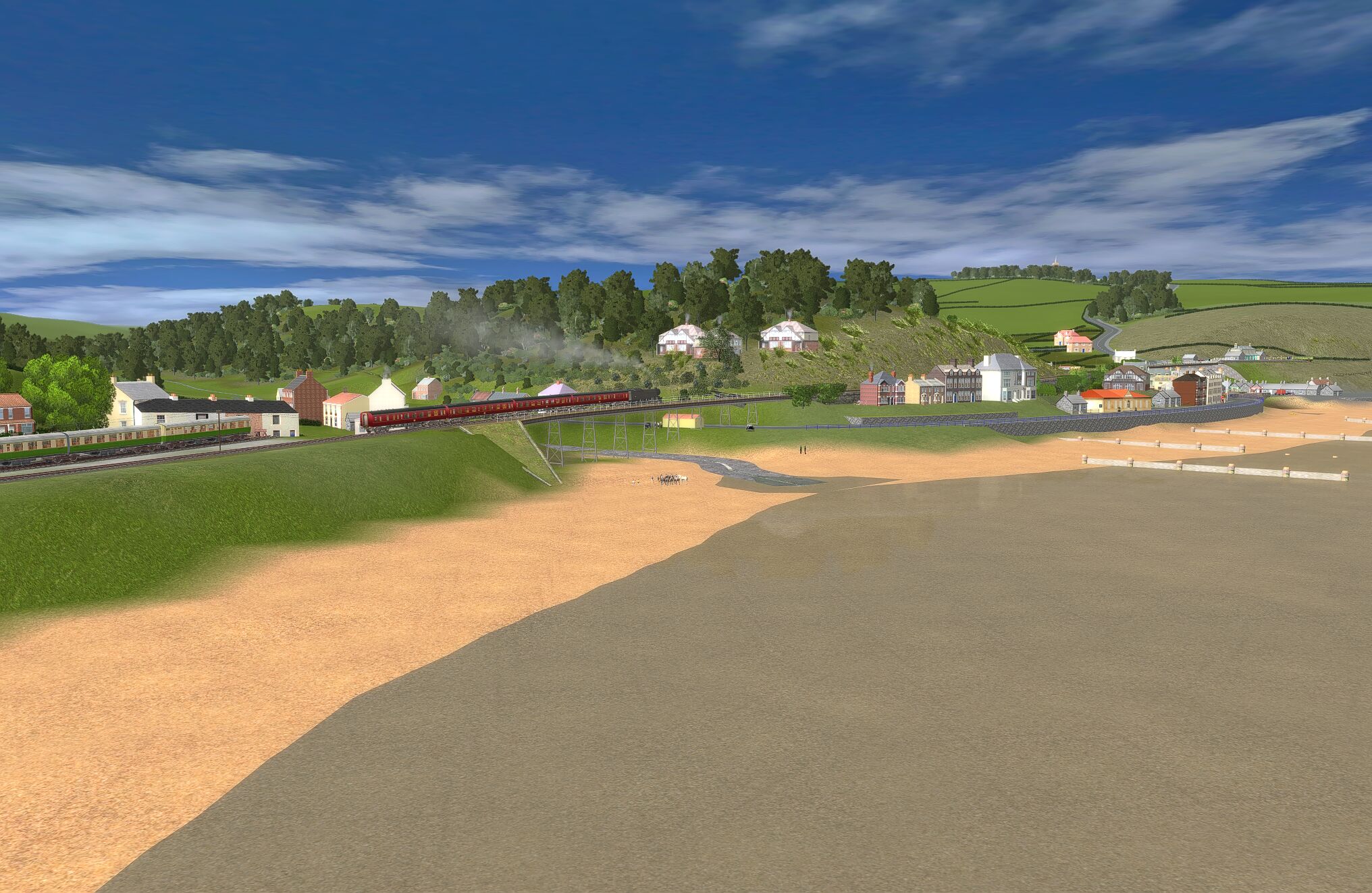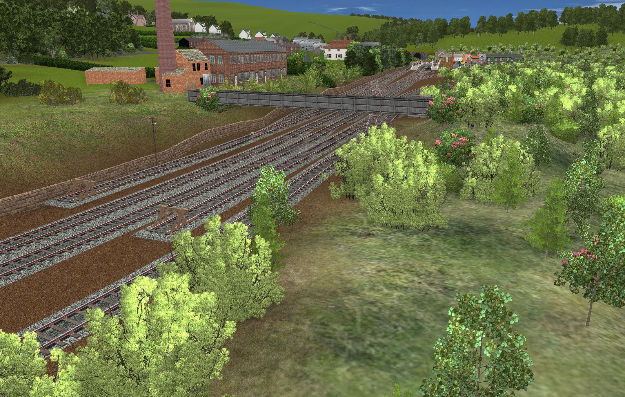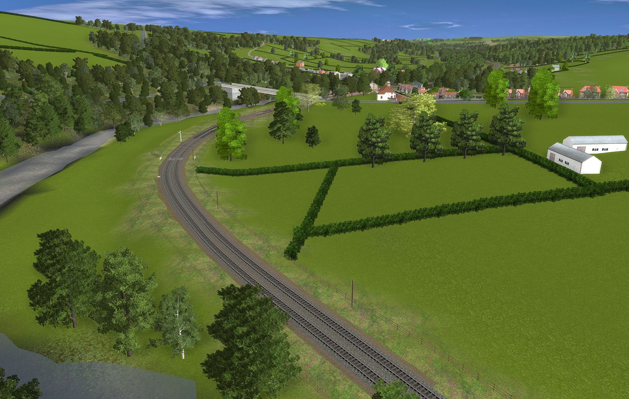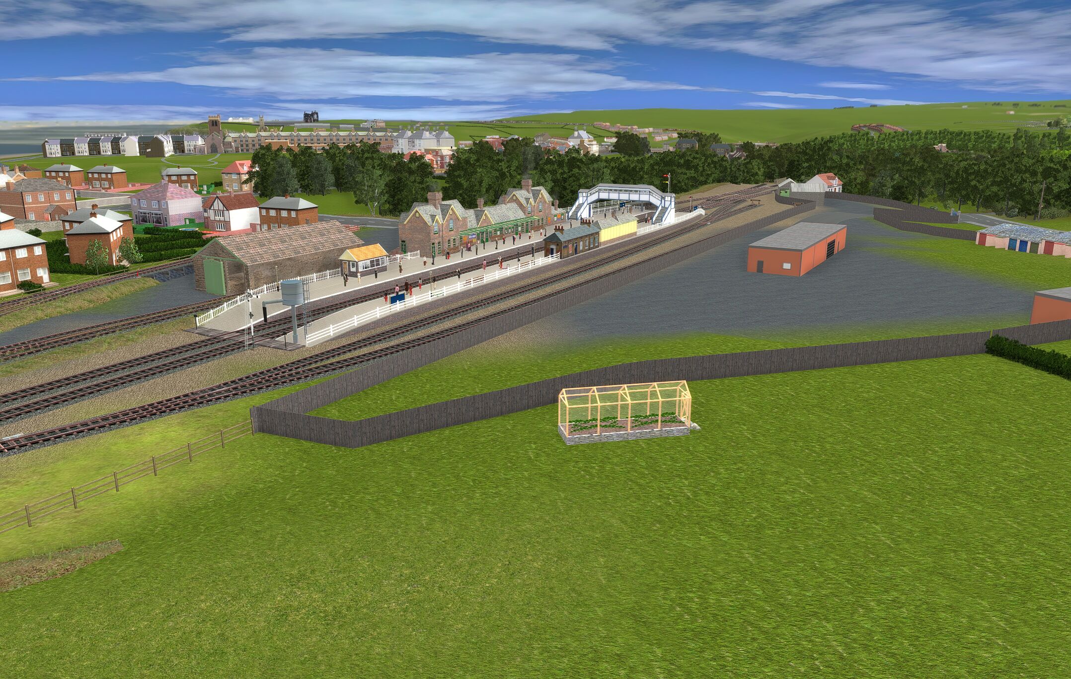 | The layout is based in the 1950s and uses only assets freely available on the Download Centre. Consequently much original detail cannot be recreated. The terrain is created from a digital OS map and so is reasonably accurate as are distances and rail line gradients. |