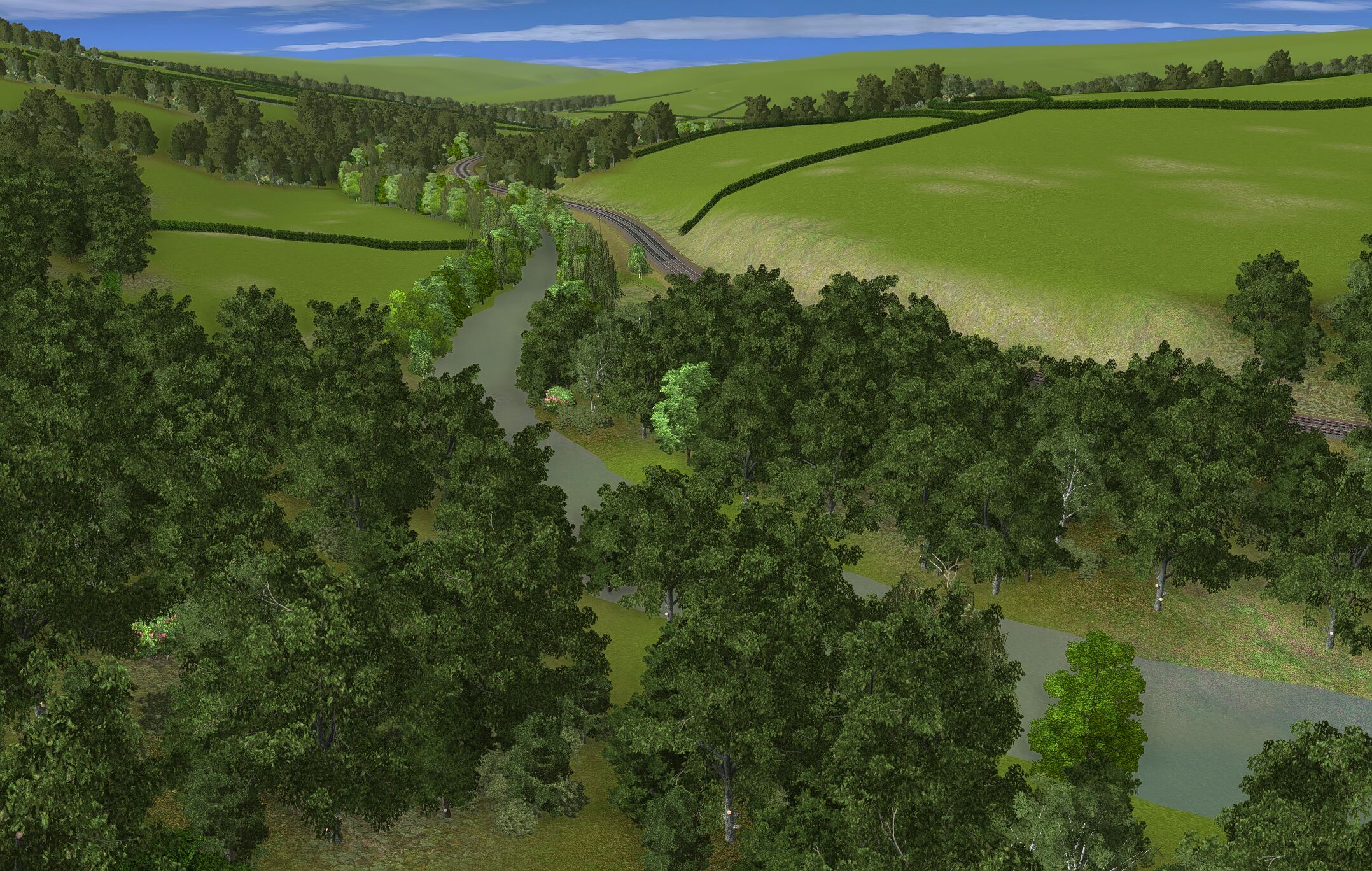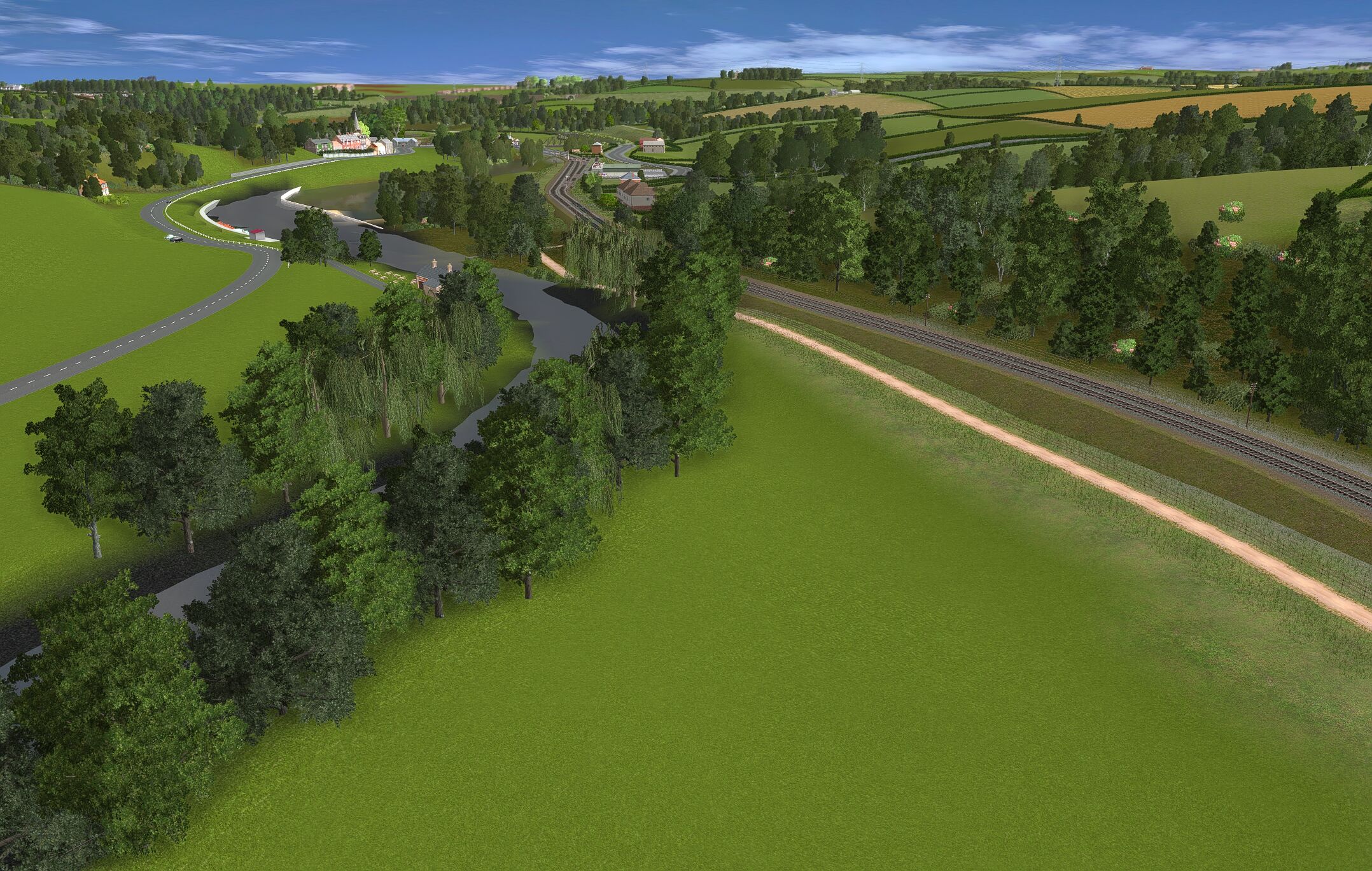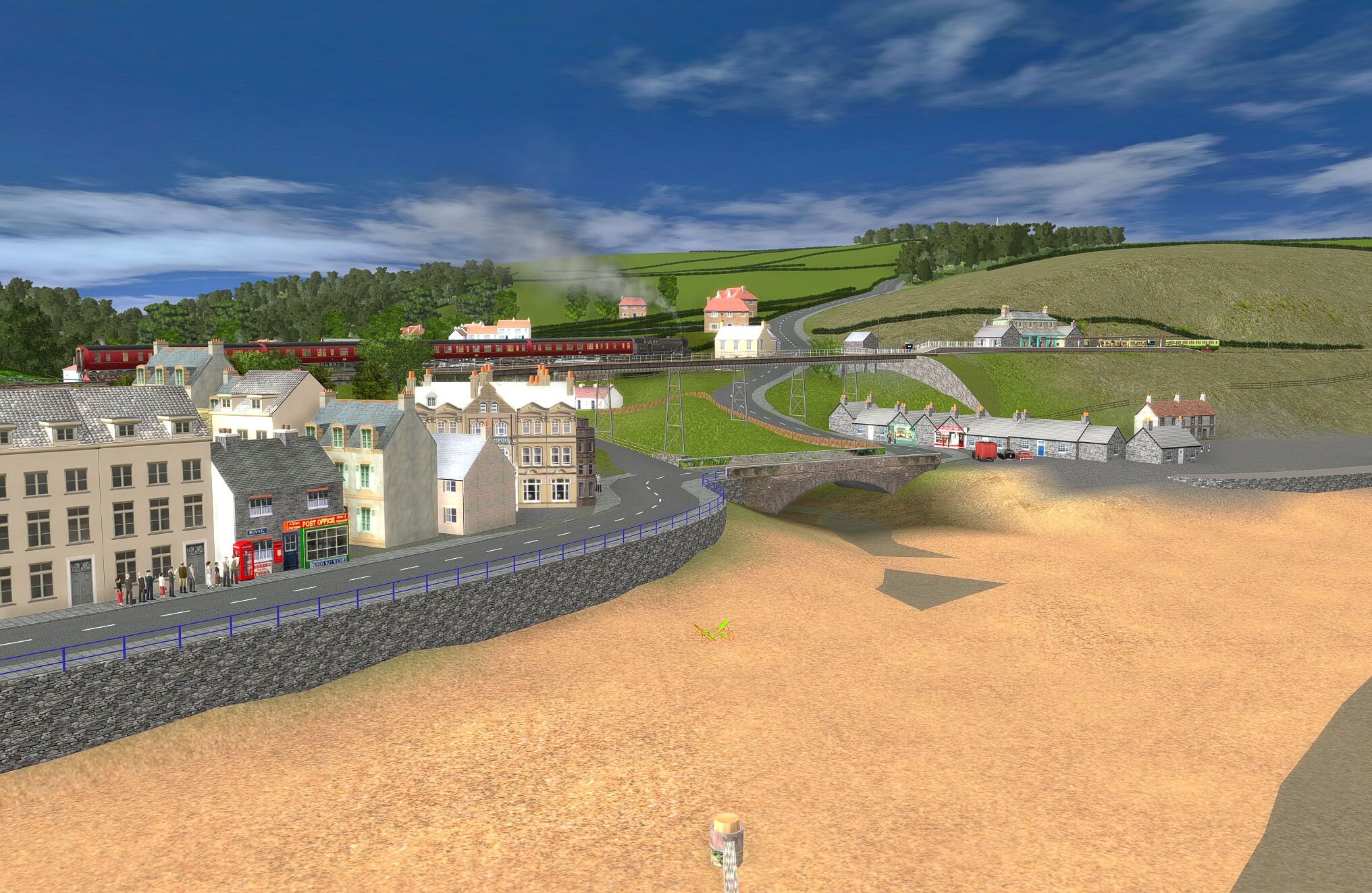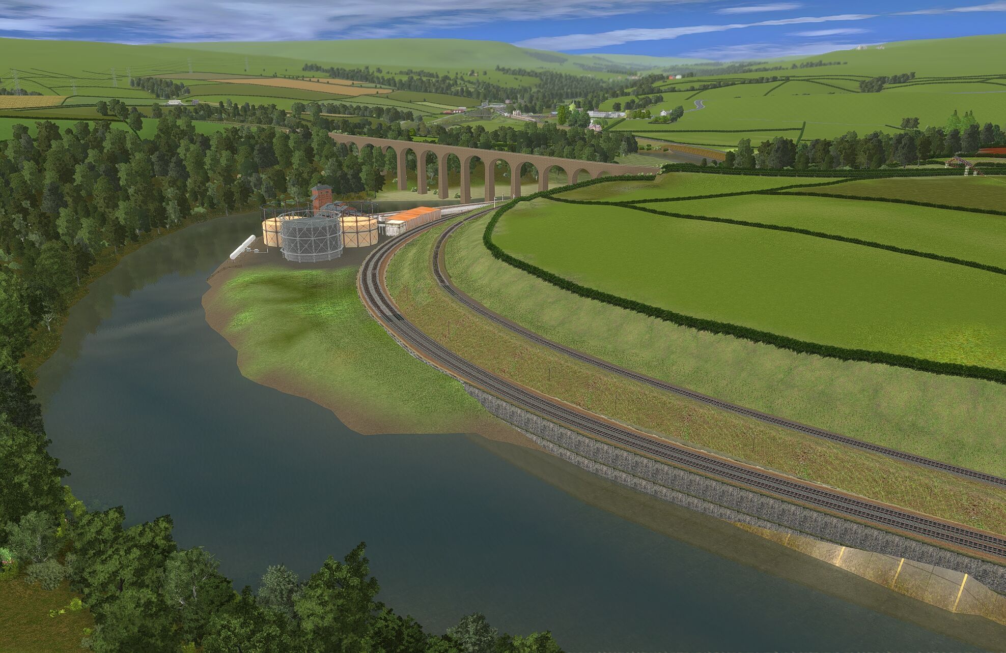 | The layout is based in the 1950s and uses only assets freely available on the Download Centre. Consequently much original detail cannot be recreated. The terrain is created from a digital OS map and so is reasonably accurate as are distances and rail line gradients. |