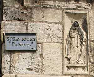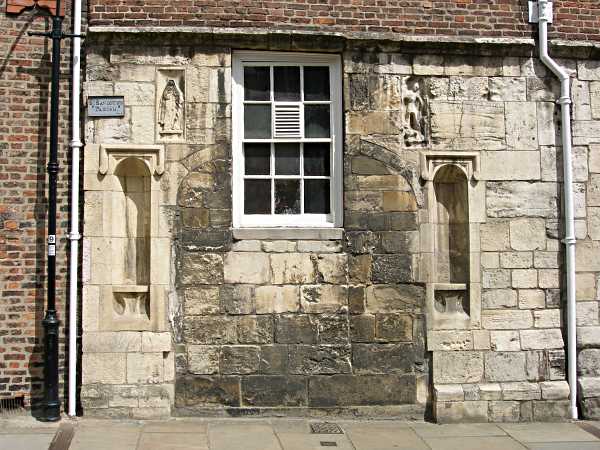 Detail of restored carving above original entrance. The plaque on the left is a mid-19th century parish boundary marker.