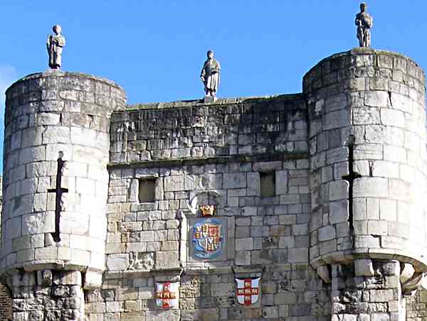 On left: a mason.In centre: Nicholas Langton, a 14th century mayor.On right: a knight.