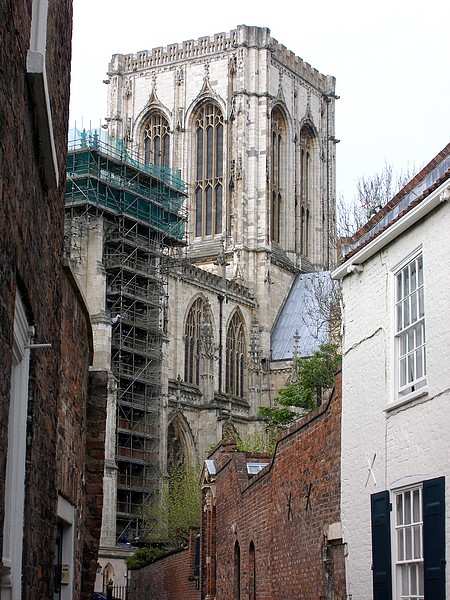 Minster Central Tower from Chapter House Street.The central tower of the Minster is of 15th century build. In the late 14th, early 15th century the central tower was being remodelled when in 1407 it collapsed. Over the next 60 years the tower we see today was built. It is 64 m (210 ft) high and has an accessible walkway round the top with views of York and the surrounding Vale of York to the Pennines, Moors and Wolds. Photo: taken Sunday morning, 29 April 2007. |