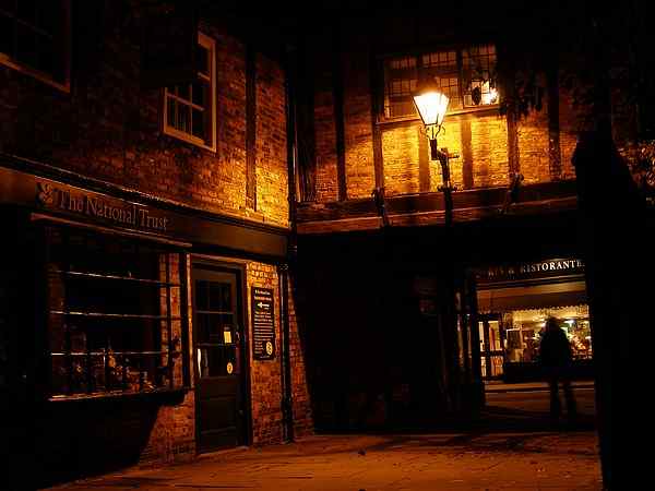 The old entrance to College Street by night.The houses to the left attached to the overhead section are of 14th century origin, though much altered. The section over College Street is of very early 17th century. Photo: taken 30 October 2005. |