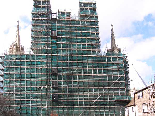 The Minster east end under repair and renovation.At all times some part of the Minster exterior is undergoing repair and renovation. At this time (2006-8) it is the east end (seen here enveloped in scaffolding) and including the 23 m (76 ft) high and 10 m (23 ft) wide Great East Window of 1405-8, the largest single area of medieval stained glass in the world. Photo: taken 18 March 2006. |