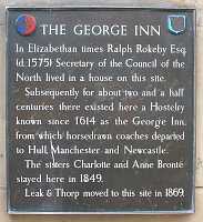 18th and early 19th century posting innThe George Inn occupied this site from 1614 to 1869 when it was removed to be replace by a store. The column to the left of the car in the photgraph survives to this day and a nearby plaque commemorates the inn's existance. In the 1700s and early 1800s the inn held the monopoly for mail coaches. As the roads improved with the introduction of turnpikes, the speed of coaches also improved, with the journey to London from York taking 96 hours in 1706 and 30 hours in 1818. By 1836 the journey had been cut to 20 hours, but the advent of the railways in the 1840s took the business away from coaches and thus from coaching inns so that by 1869 the George was considered redundant and removed. ![]() Commemorative plaque. Photo: taken Sunday morning, 29 April 2007. |