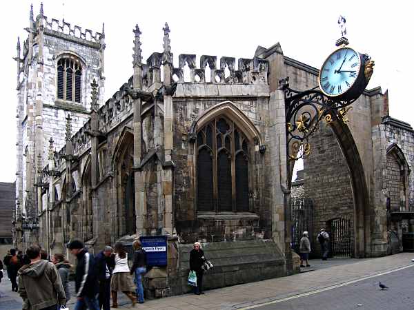 St Martin-le-GrandSt Martin's, Coney Street, is possibly of pre-Conquest origin probably being the St. Martin's mentioned in Domesday (although this may also refer to St. Martin's, Micklegate). A church on this site is first documented in the third quarter of the 12th century. The present building has a history dating from the second quarter of the 15th century and contains the 15th century west window depicting St. Martin of Tours (fortunately removed before WW2 and now rehoused in the restored south aisle). The church was restored in 1862 and destroyed in the 1942 air raid on York. The south aisle has been restored (1961-8) as a Shrine of Remembrance to the City's dead in the two world wars. Photo: taken 19 March 2006 |