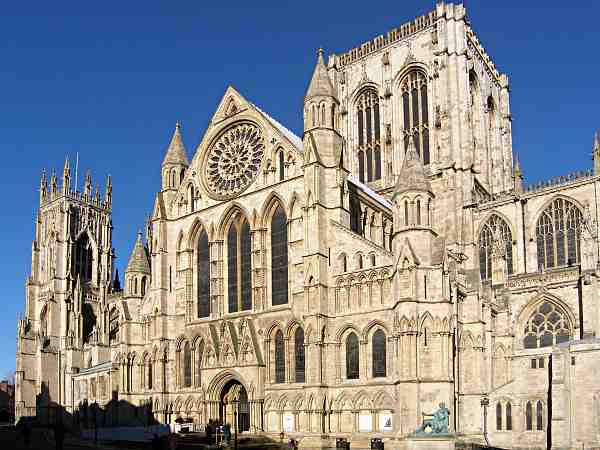 From the south eastThe minster is the largest Gothic Cathedral in Northern Europe. It's medieval stained glass is unparalleled, and in the new crypt are the remains of the Roman Basilica Principiorum, the main headquarter offices of the Roman fortress of Eboracum. On the left is the south west tower of 1435+, then the south trancespt of 1220-40, the central tower of 1407-70, and just appearing on the right, the choir of 1373-1405. Photo: taken 2 February 2007 |