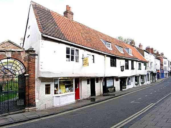 60-72 Goodramgate: built in the early 14th century.Built around 1320, the houses in this row are the oldest in York. They were built on the churchyard of Holy Trinity church to raise money for the church. House numbers 64-72 are much as built being of two story timber framed construction. There were originally 11 bays built, with the one on the end to the south being demolished to make way for the new gate into the churchyard in the mid-18th century. At the north end, the very end bay (part of number 60) was heightened to three stories about 1840 and the second and third bays from the north (number 60/62) were rebuilt in the 1780s. (Ref. 1) Photo: taken Sunday morning, 29 April 2007. |