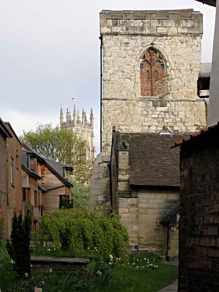 Holy Trinity Church and the MinsterThe two towers date from about the same time, the early to mid 15th century. The minster tower is the south west tower and on this day in late April is flying the flag of St. George, perhaps for St. George's Day celebrations. St. George's Day is 23rd April and as a Boy Scout in the 1950s we paraded (starting in Parliament Street) to and from a Minster service on the nearest Sunday to the 23rd. Sitting in the unheated Minster in short sleeves and shorts in April is not to be recommended of the faint hearted! Photo: taken Sunday morning, 29 April 2007. |