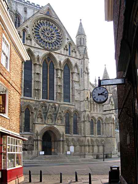 South TranseptThis is the view from Petergate looking through Minster Gates to the South Door of the Minster, showing the beautiful Rose Window (Early 16th century). Despite what the clock says, the photo is timed at 6.35 am! Early Sunday morning is one of the few times in the week when the streets of York are almost free from traffic and pedestrians. Photo: taken 29 April 2007 |