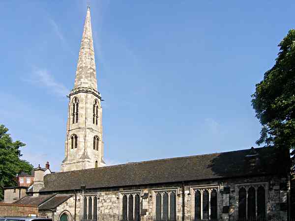 15th century and later.All Saints church was established in the 11th century and enlarged successively until the 15th. Much of the 15th century glass remains (as well as some from the 14th) and the church is noted for this. The south wall (shown here) is 19th century from a major restoration in 1867. A further restoration was carried out in 1977. The spire rises to a height of 36 m (120 ft). (Ref. 1b) Photo: taken 3 June 2007 |