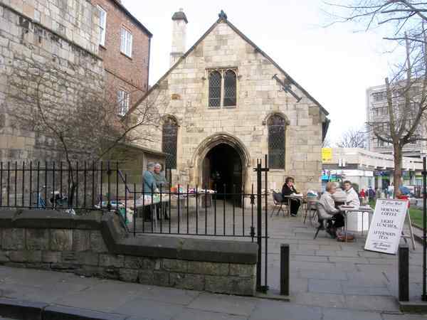 The hall has the traceried door from the church and is now used as a cafe with many yard sales held throughout the year, as in this photograph.