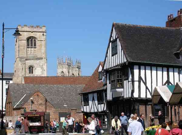 The towers of the Minster and St Sampson's Church together with medieval building.