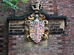 The Terry shield of arms surrounded by the inscription: These almshouses were erected by public subscription to the memory of the late Sir Joseph Terry. 1899.