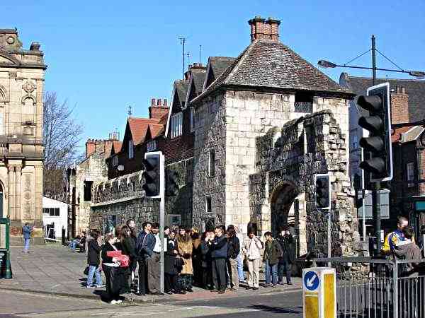 Wall od St Mary's AbbeyThe Abbey wall once continued almost up to the City wall with no access until Queen Margaret's arch was cut through. In this picture the walls can be seen running behind the houses in Bootham, where it continues to Marygate, thence turning at right angles and running down to the river. Photo: taken 5 April, 2006. |