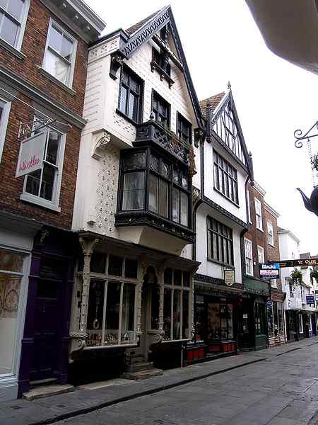 15th (35) and 17th (33) centuries.Both timber framed and jettied. Number 33 (nearest) is the older, though the carved decorated front, including the shop front are of the late 19th century (the date carved in of 1682 is meaningless). Number 33 is of the early 17th century though, like number 35, the carving on the front is of the late 19th century and the date (1489) is meaningless. (Ref. 1) Photo: taken Sunday morning, 29 April 2007. |